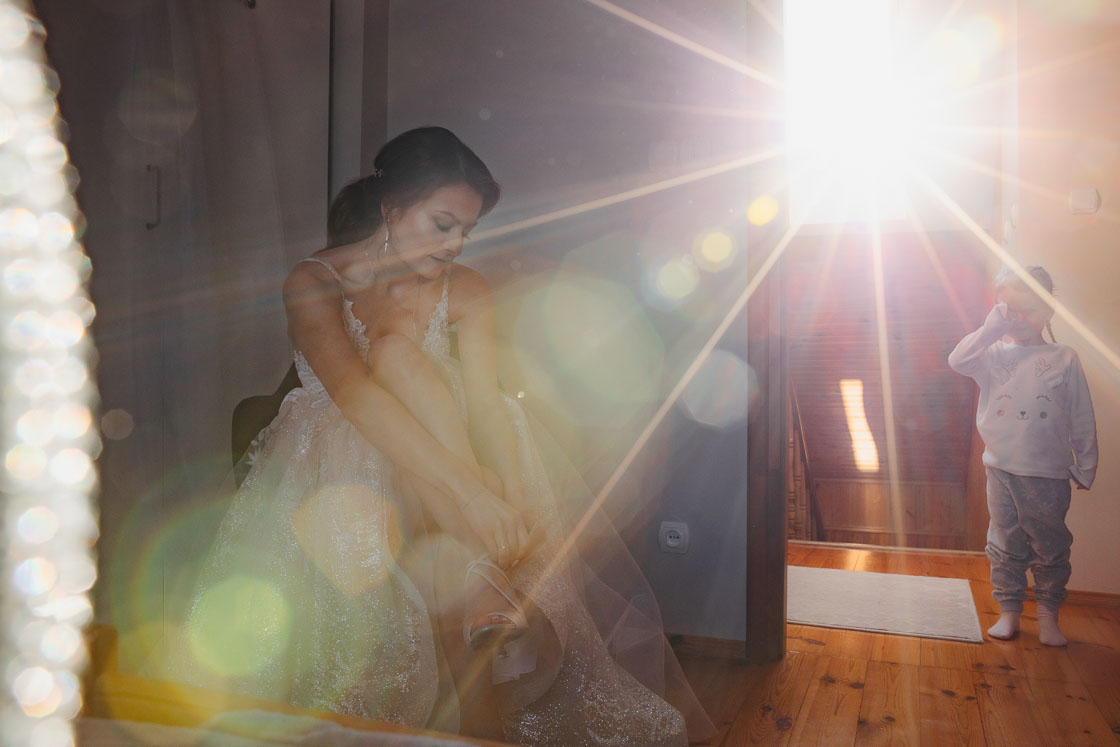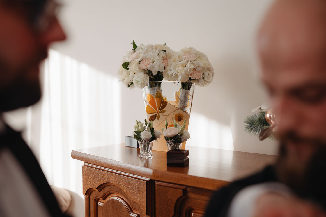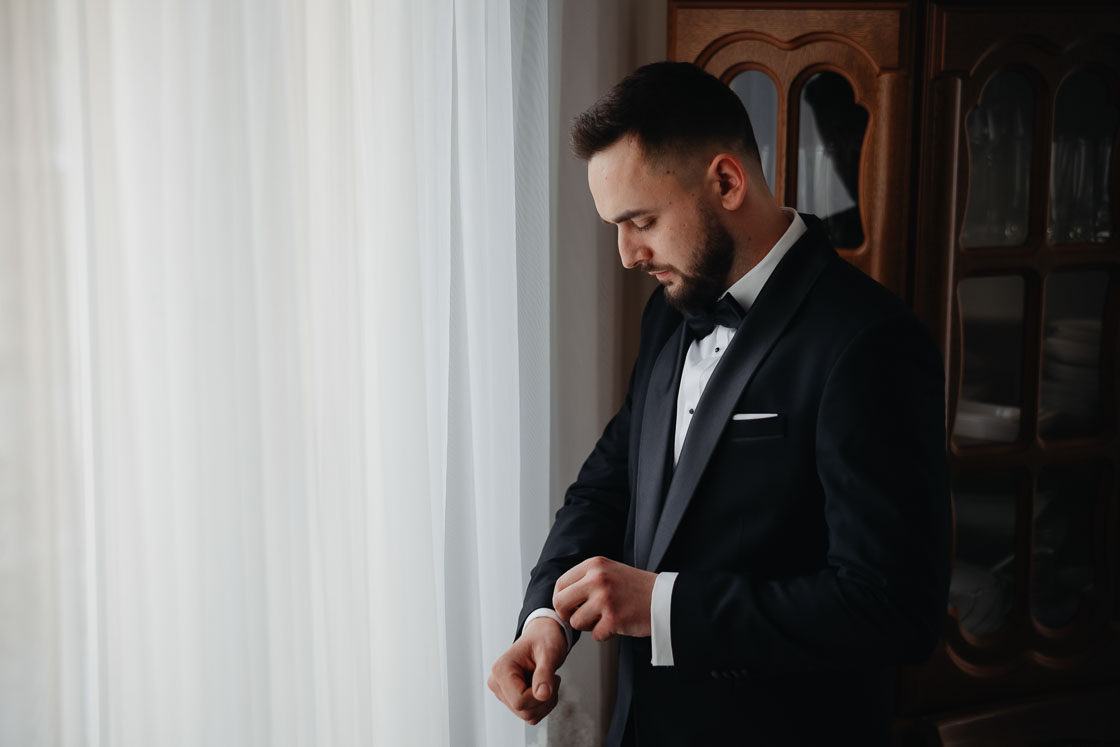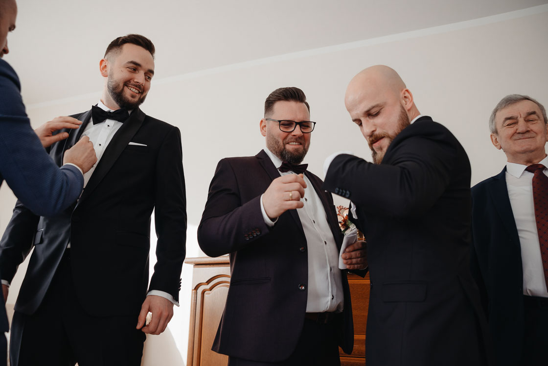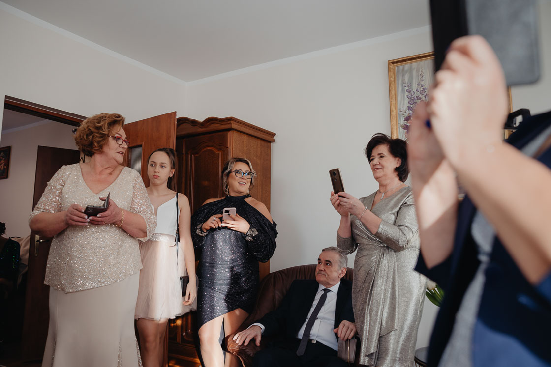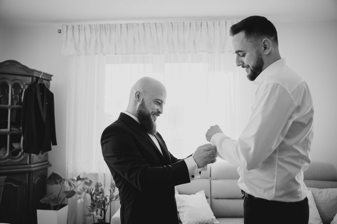 Przygotowania do ślubu to moment, w którym wiele się dzieje zarówno u Panny Młodej, jak i u Pana Młodego. Tym bardziej, kiedy odbywają się w gronie najbliższych, którzy również całymi sobą przeżywają ślub. Każdy krząta się po domu, przygotowując się na swój sposób. Bracia Sylwii znaleźli zajęcie przy dekoracji domu. Rodzina Adama urozmaicała mu moment ubierania. Wiele się działo. Lubię takie sytuacje, nieoczywiste momenty, historie, które dzieją się pomiędzy i dodają różnorodności ujęć w harmonii całego dnia ślubu.