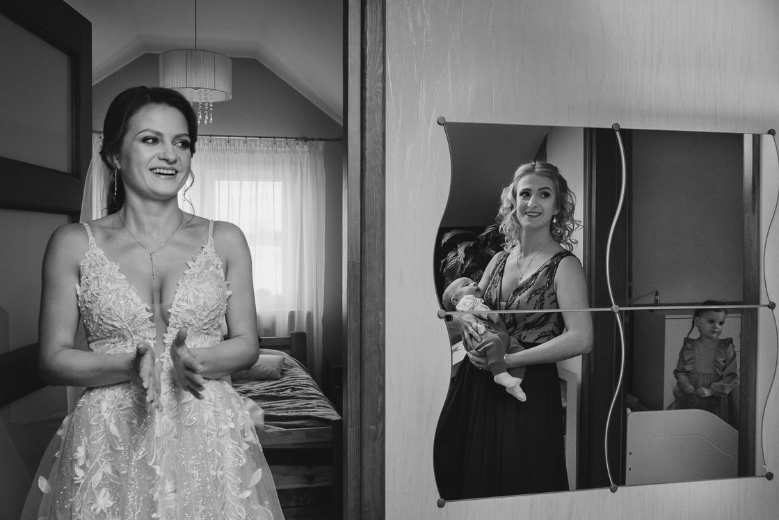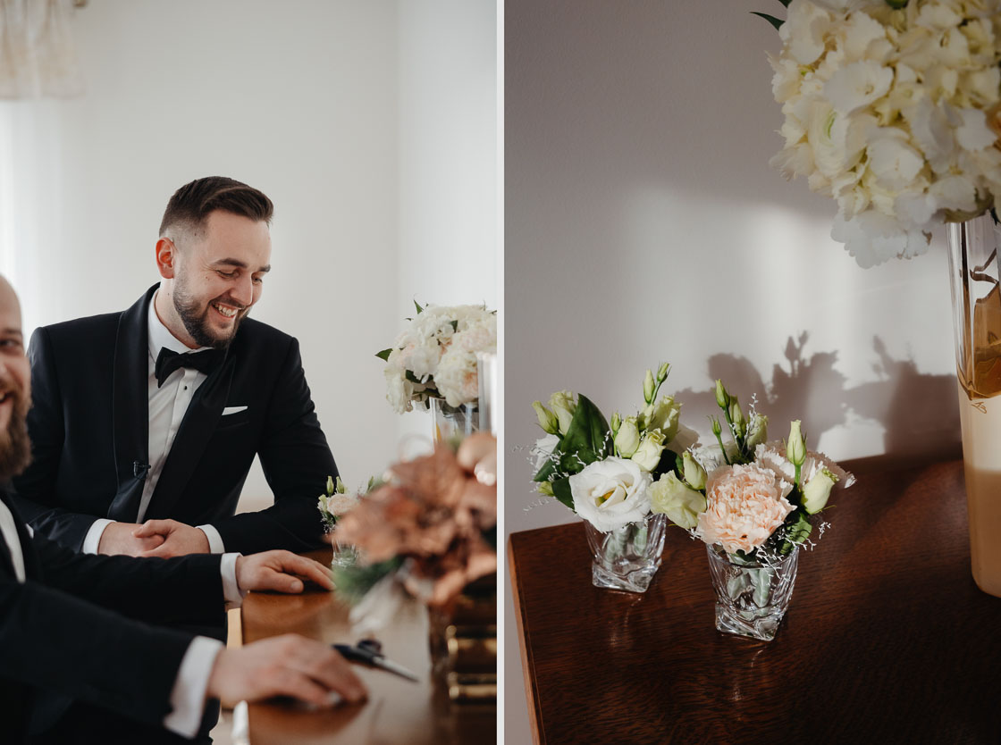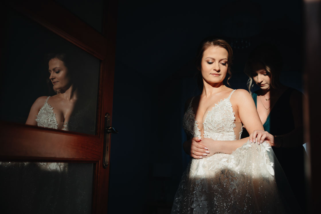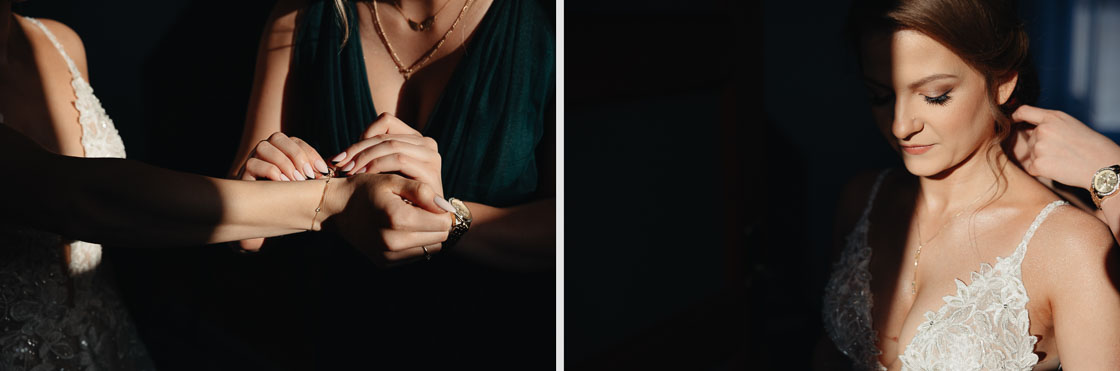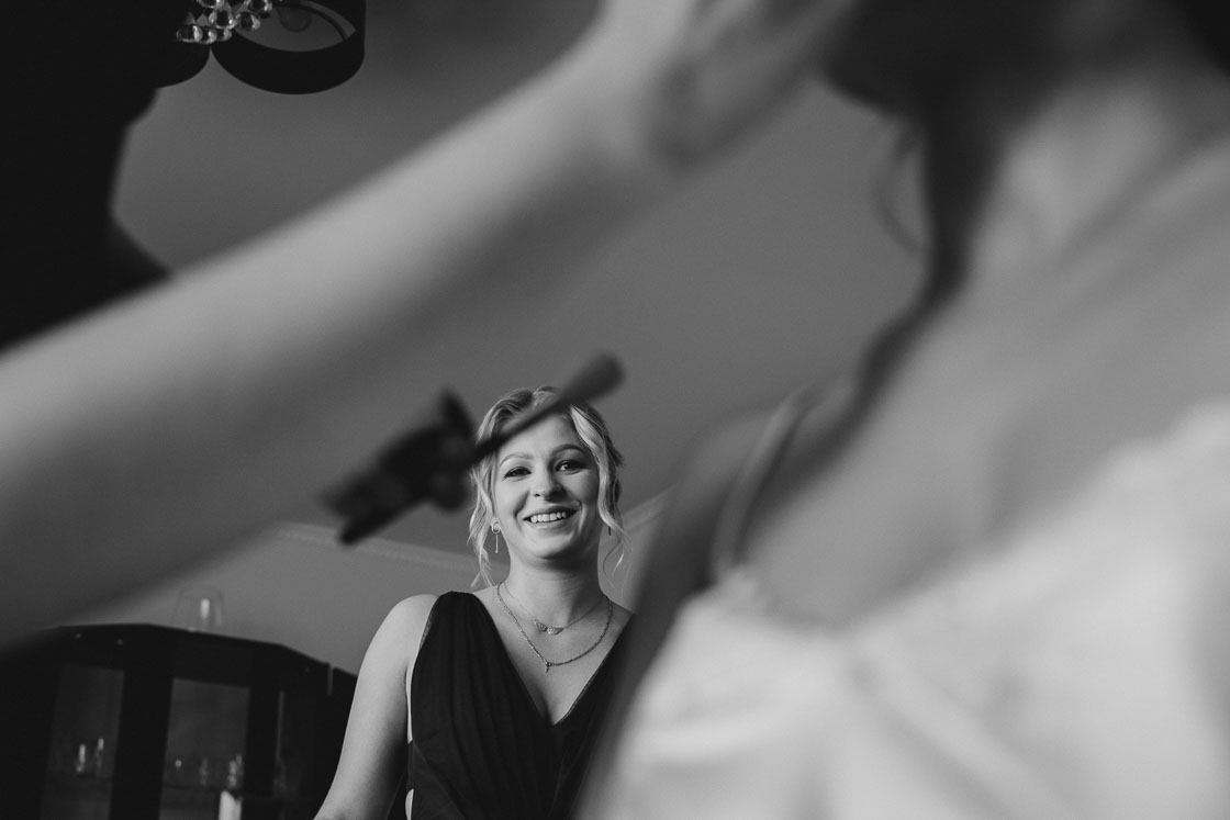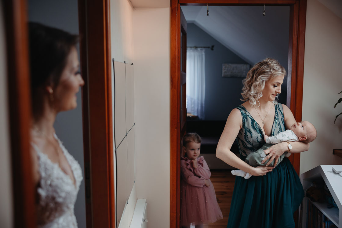 Przygotowania do ślubu to moment, w którym wiele się dzieje zarówno u Panny Młodej, jak i u Pana Młodego. Tym bardziej, kiedy odbywają się w gronie najbliższych, którzy również całymi sobą przeżywają ślub. Każdy krząta się po domu, przygotowując się na swój sposób. Bracia Sylwii znaleźli zajęcie przy dekoracji domu. Rodzina Adama urozmaicała mu moment ubierania. Wiele się działo. Lubię takie sytuacje, nieoczywiste momenty, historie, które dzieją się pomiędzy i dodają różnorodności ujęć w harmonii całego dnia ślubu.