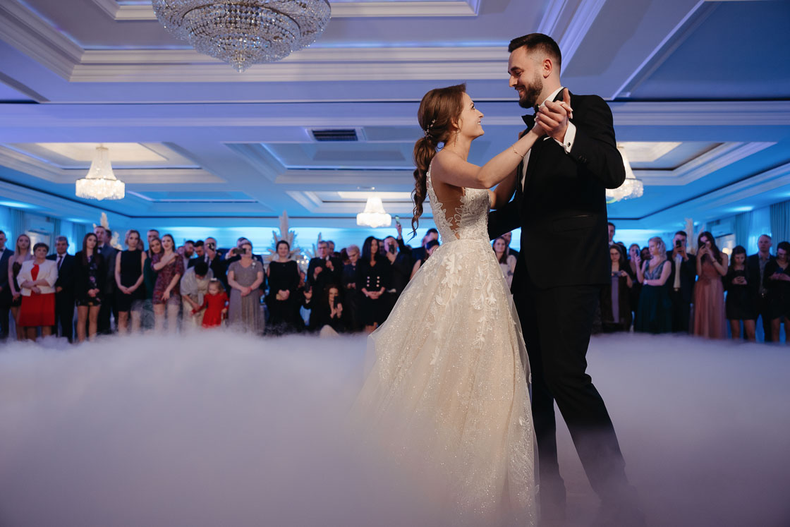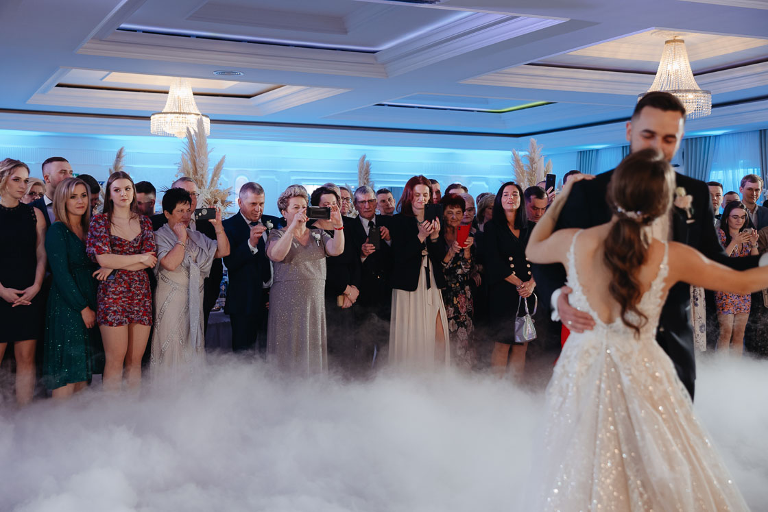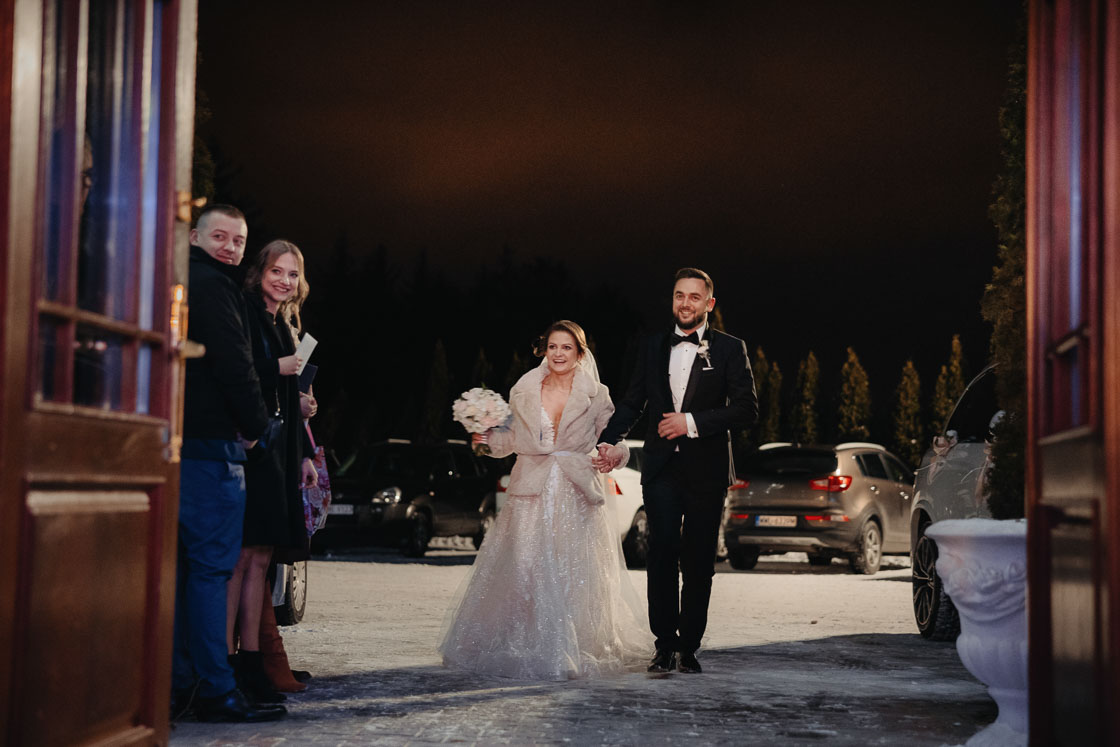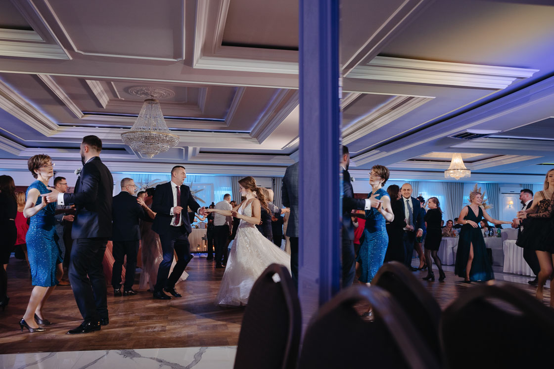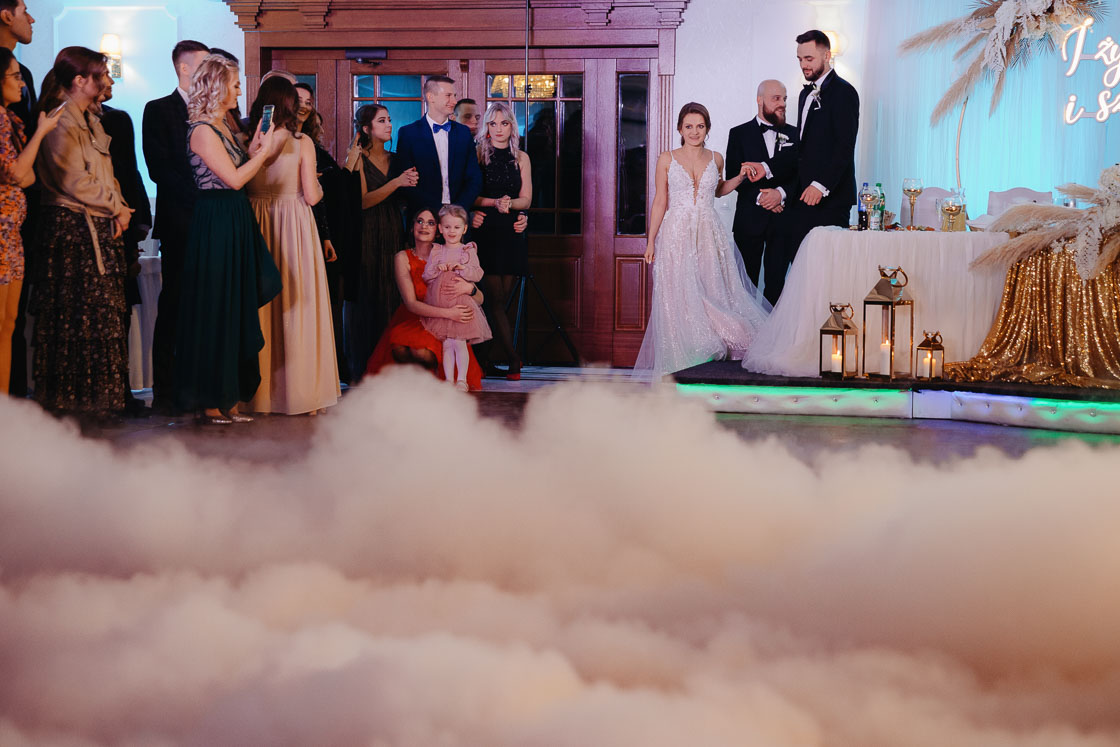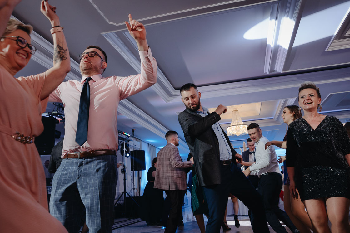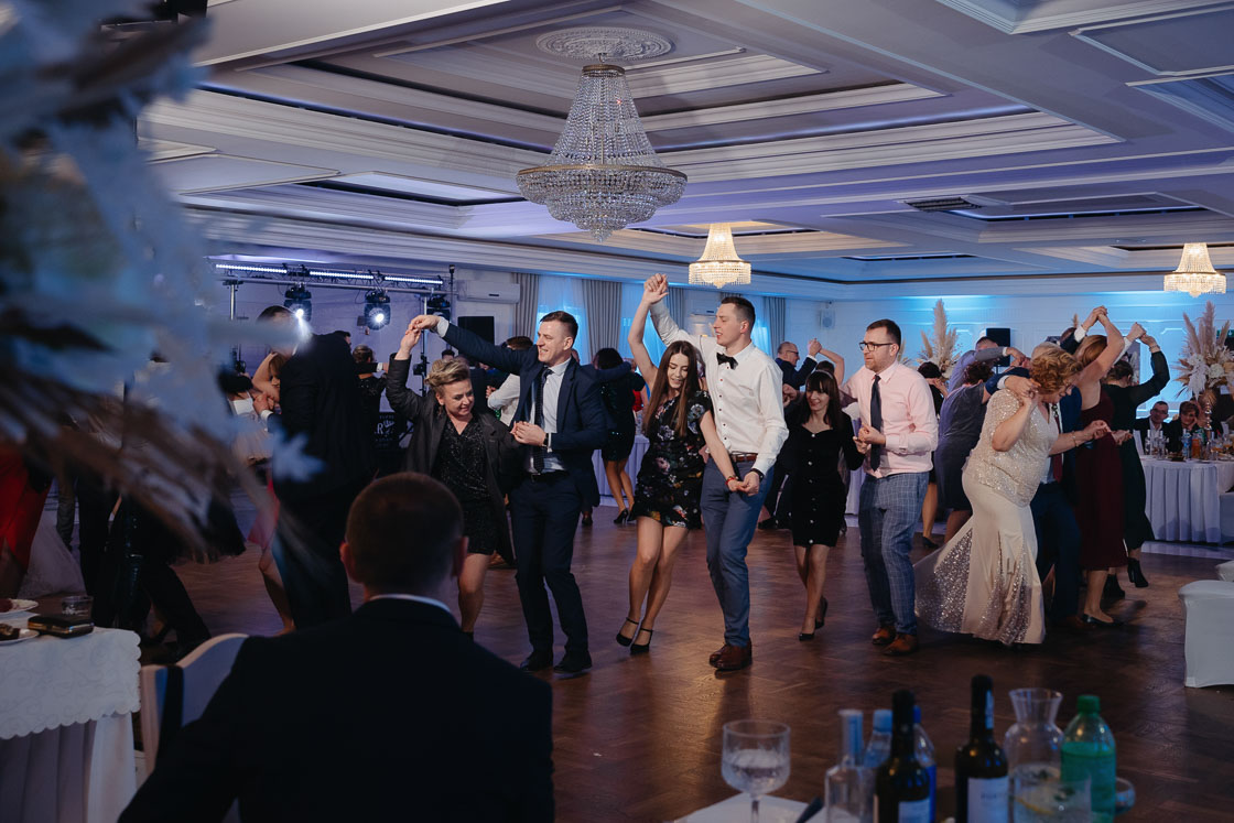Czyli moment, na który wszyscy czekali najbardziej. Nic w tym dziwnego, w końcu na dworze temperatury w okolicach zera. Przyjęcie zaczynamy spokojnie, przy akompaniamencie smyczkowym. Goście składają życzenia nowożeńcom, którzy chwilę po uroczystej kolacji otworzą parkiet zmysłowym pierwszym tańcem w chmurach. Istny spektakl, świetnie przygotowany taniec zapiera dech w piersiach. Brawo Młodzi! Wszyscy ruszamy na parkiet i bawimy się do białego rana!