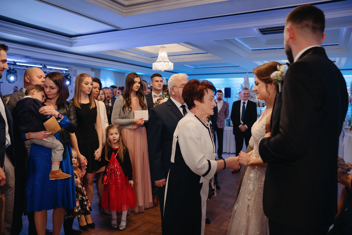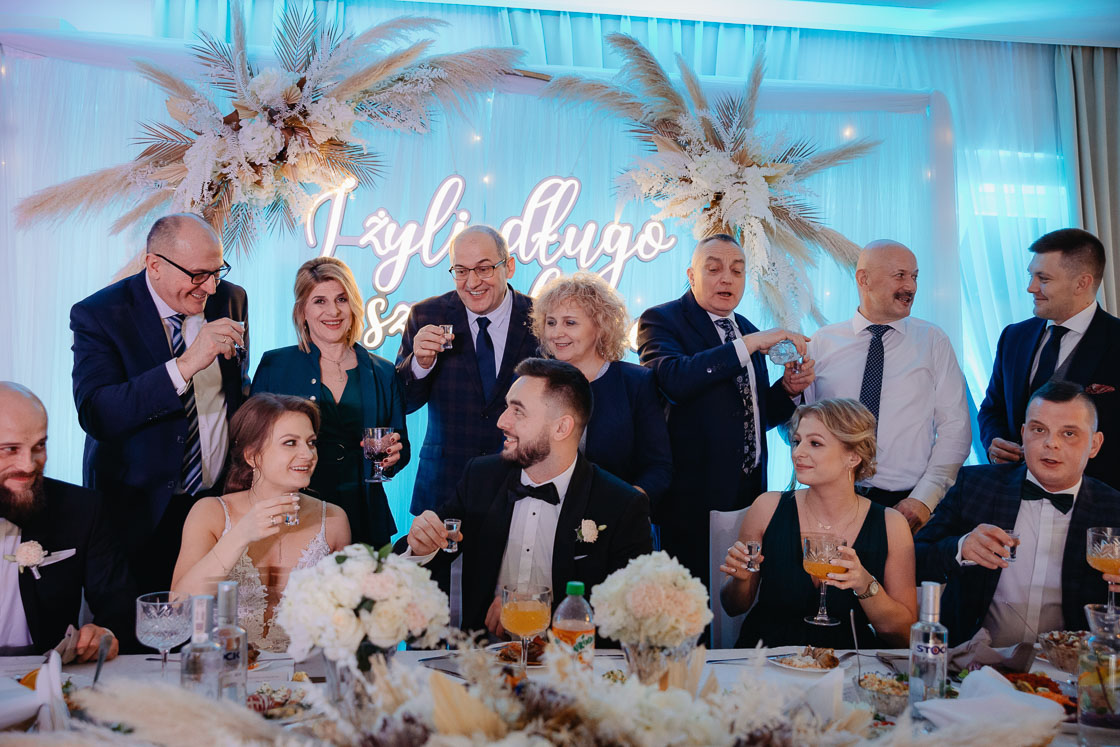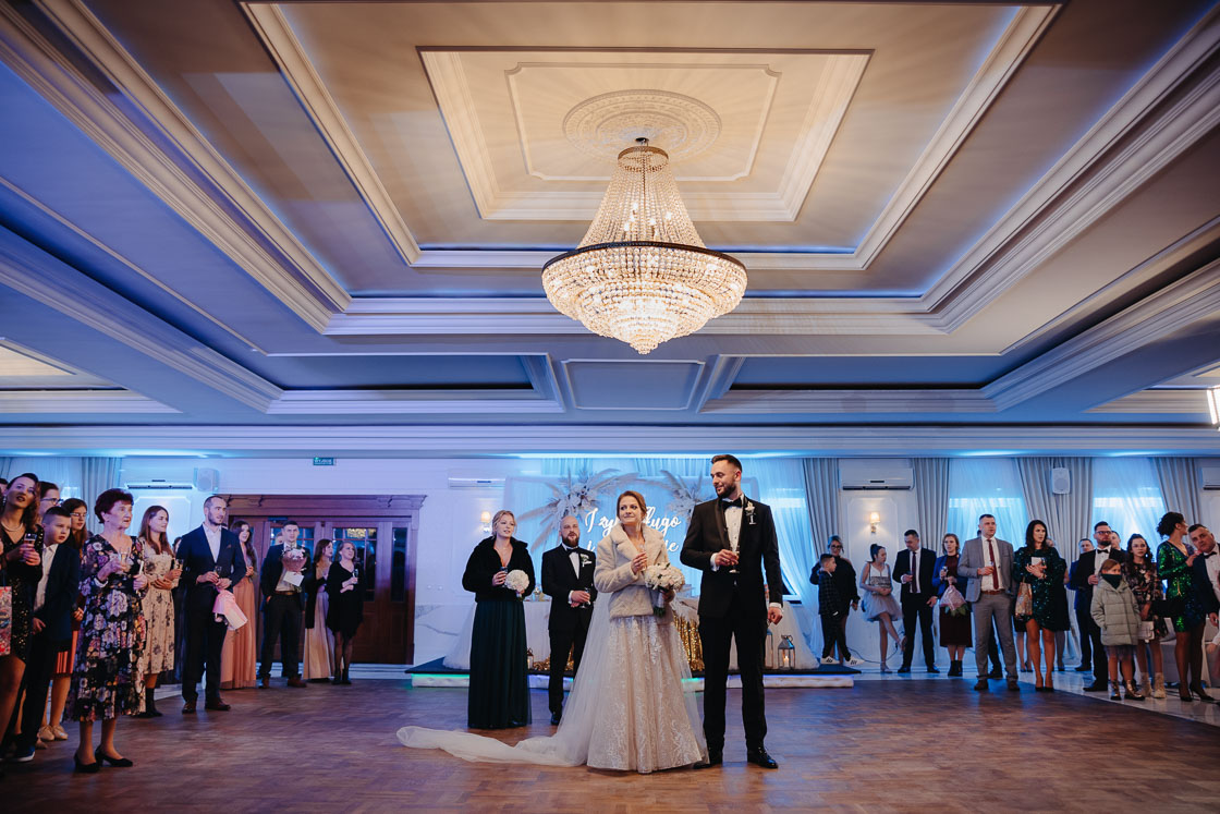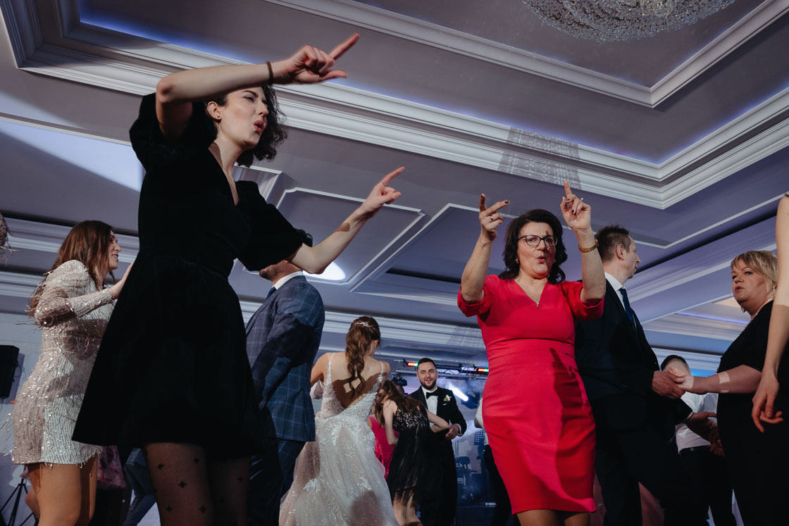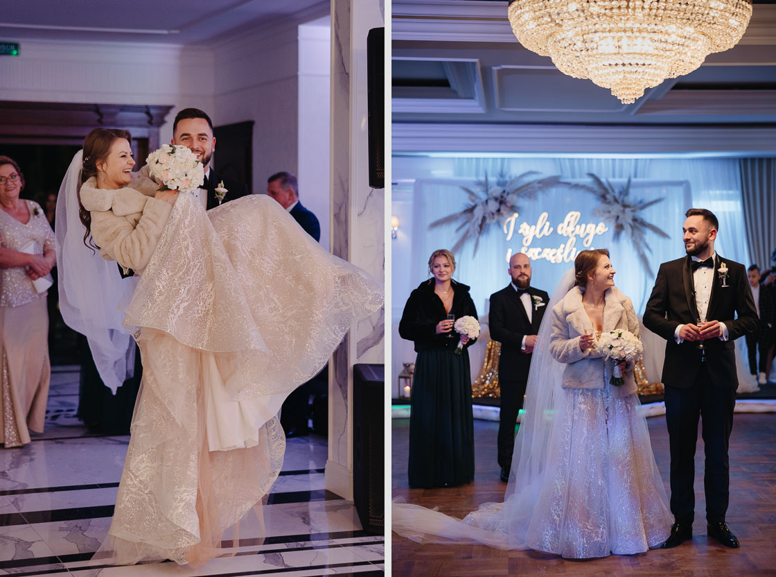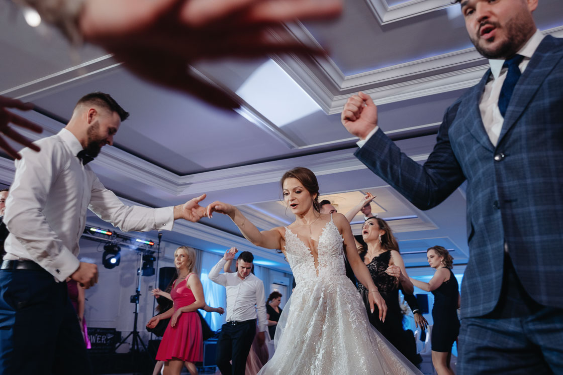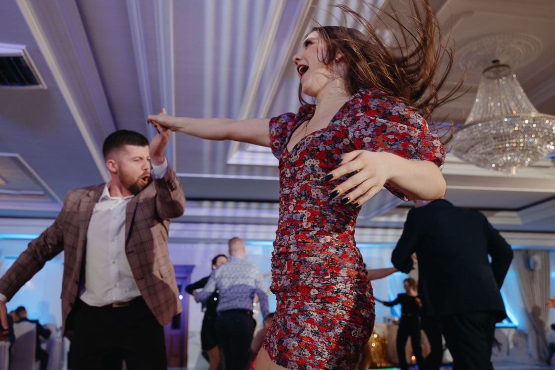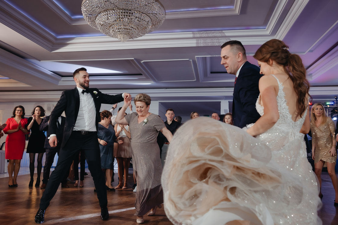 Czyli moment, na który wszyscy czekali najbardziej. Nic w tym dziwnego, w końcu na dworze temperatury w okolicach zera. Przyjęcie zaczynamy spokojnie, przy akompaniamencie smyczkowym. Goście składają życzenia nowożeńcom, którzy chwilę po uroczystej kolacji otworzą parkiet zmysłowym pierwszym tańcem w chmurach. Istny spektakl, świetnie przygotowany taniec zapiera dech w piersiach. Brawo Młodzi! Wszyscy ruszamy na parkiet i bawimy się do białego rana!