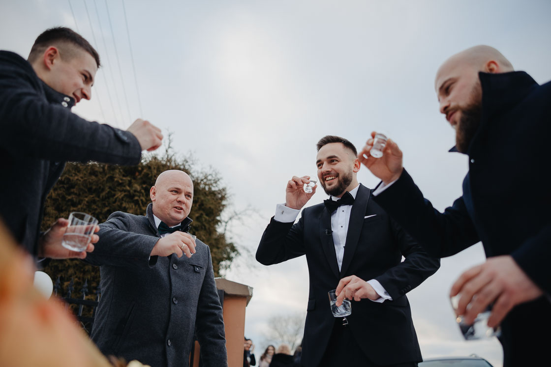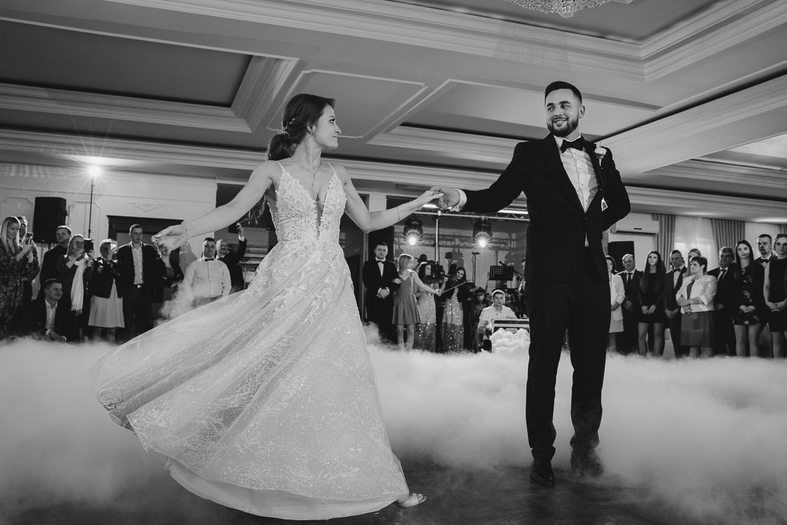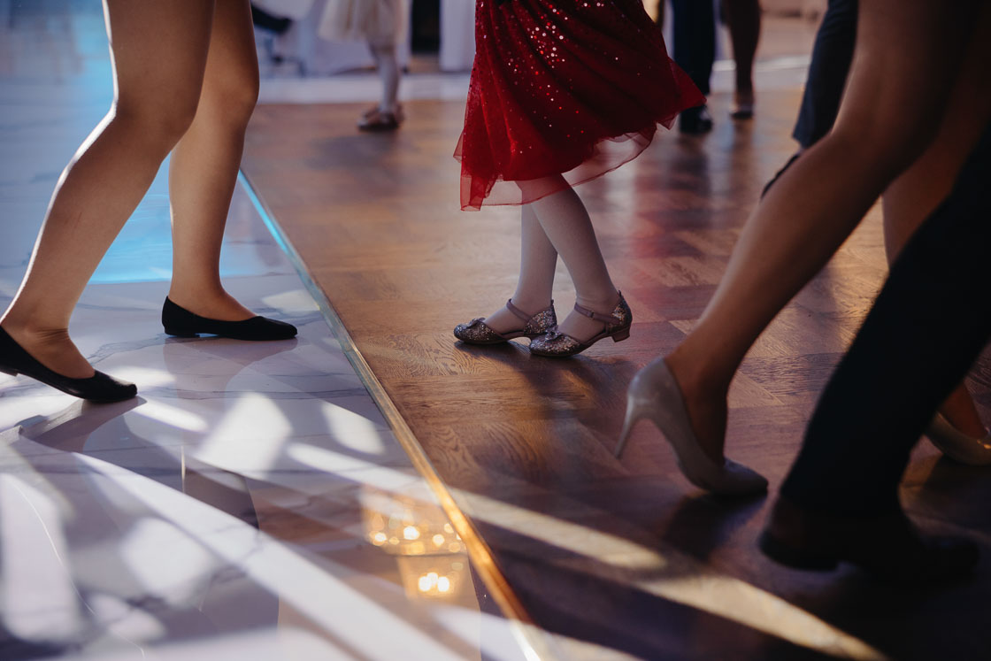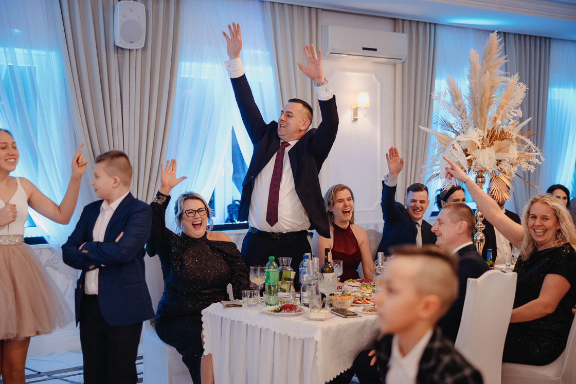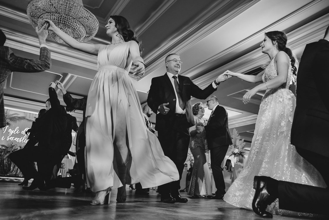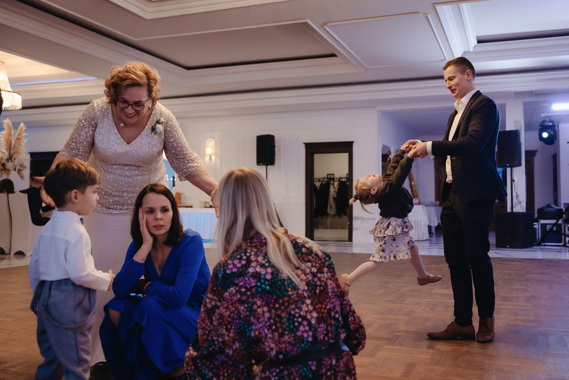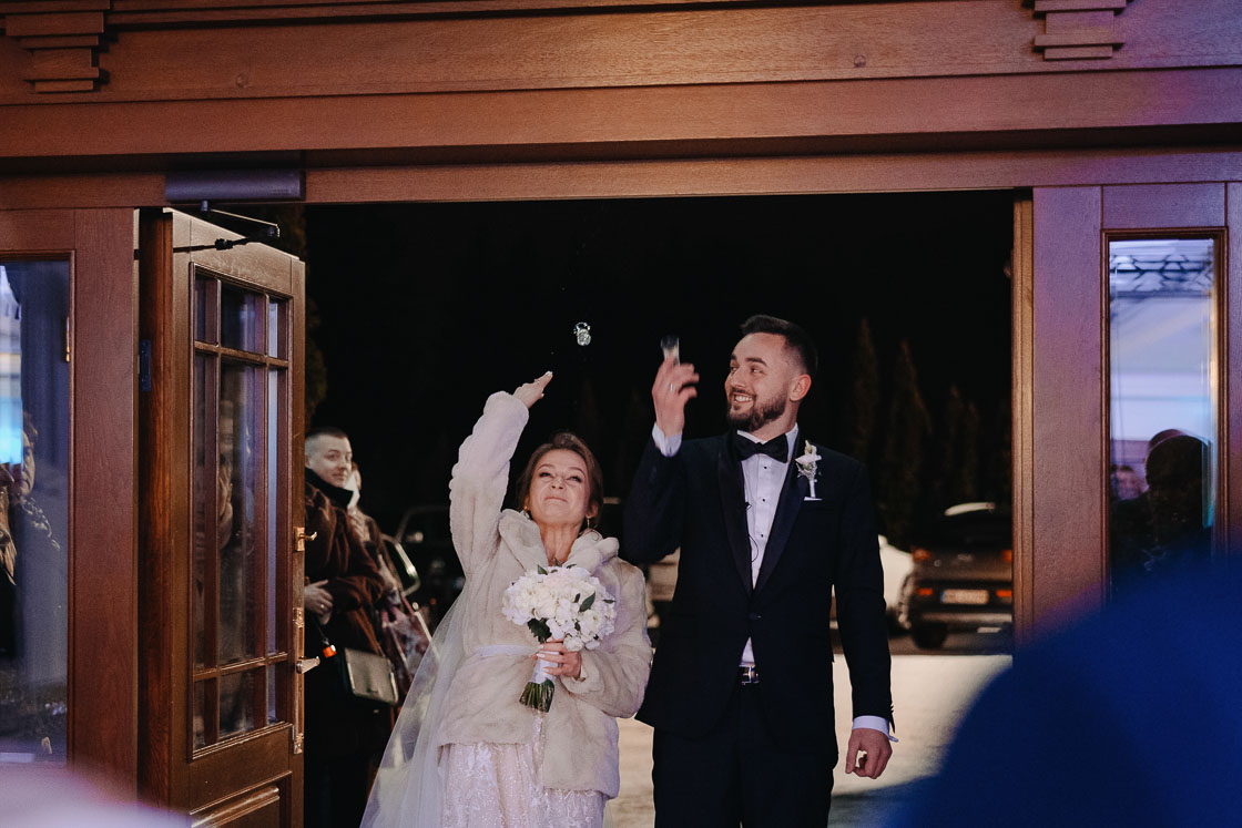 Czyli moment, na który wszyscy czekali najbardziej. Nic w tym dziwnego, w końcu na dworze temperatury w okolicach zera. Przyjęcie zaczynamy spokojnie, przy akompaniamencie smyczkowym. Goście składają życzenia nowożeńcom, którzy chwilę po uroczystej kolacji otworzą parkiet zmysłowym pierwszym tańcem w chmurach. Istny spektakl, świetnie przygotowany taniec zapiera dech w piersiach. Brawo Młodzi! Wszyscy ruszamy na parkiet i bawimy się do białego rana!