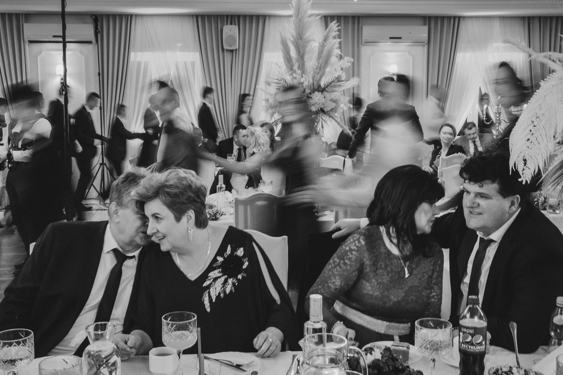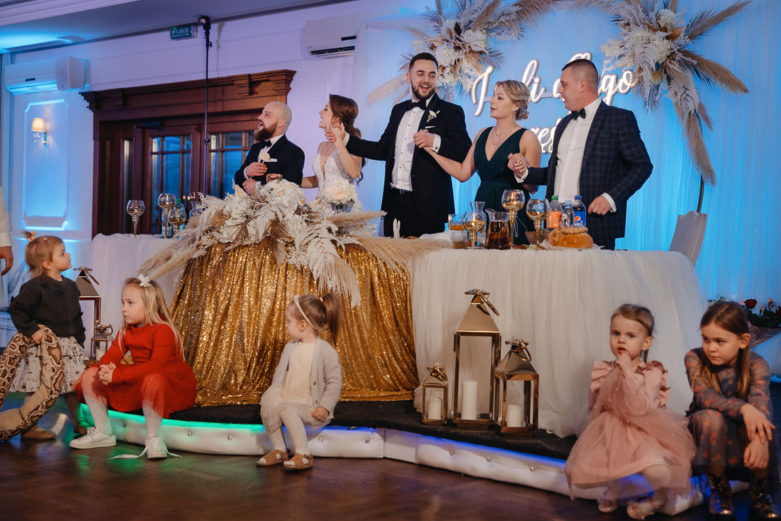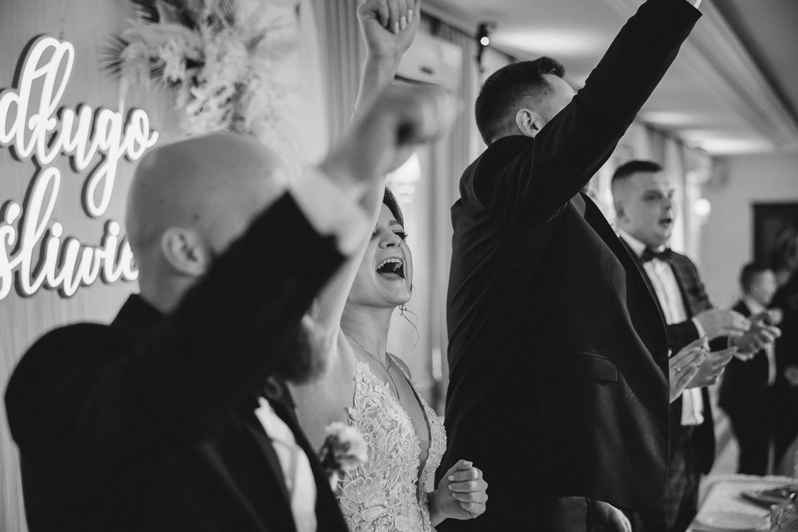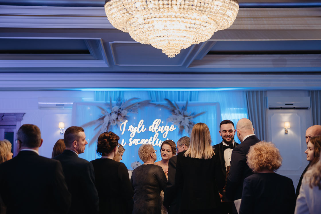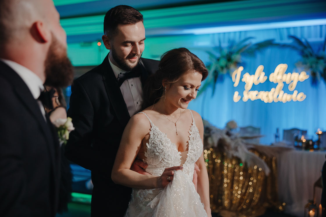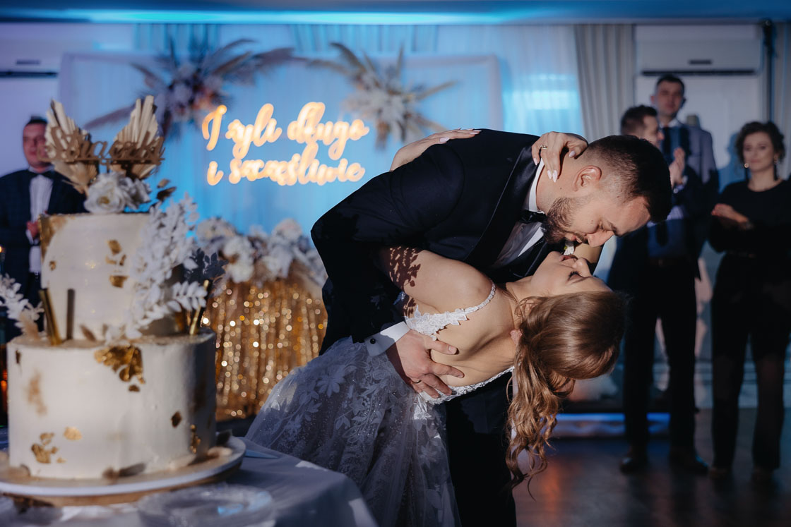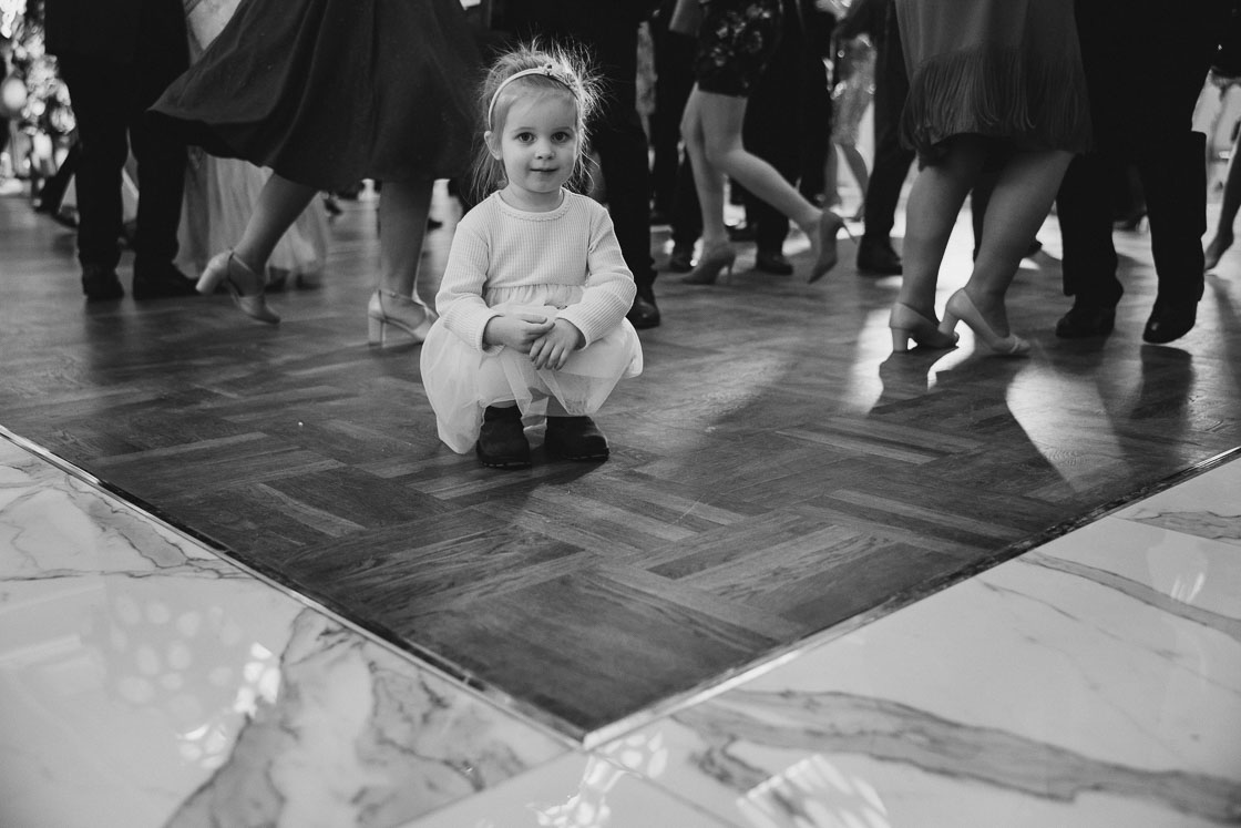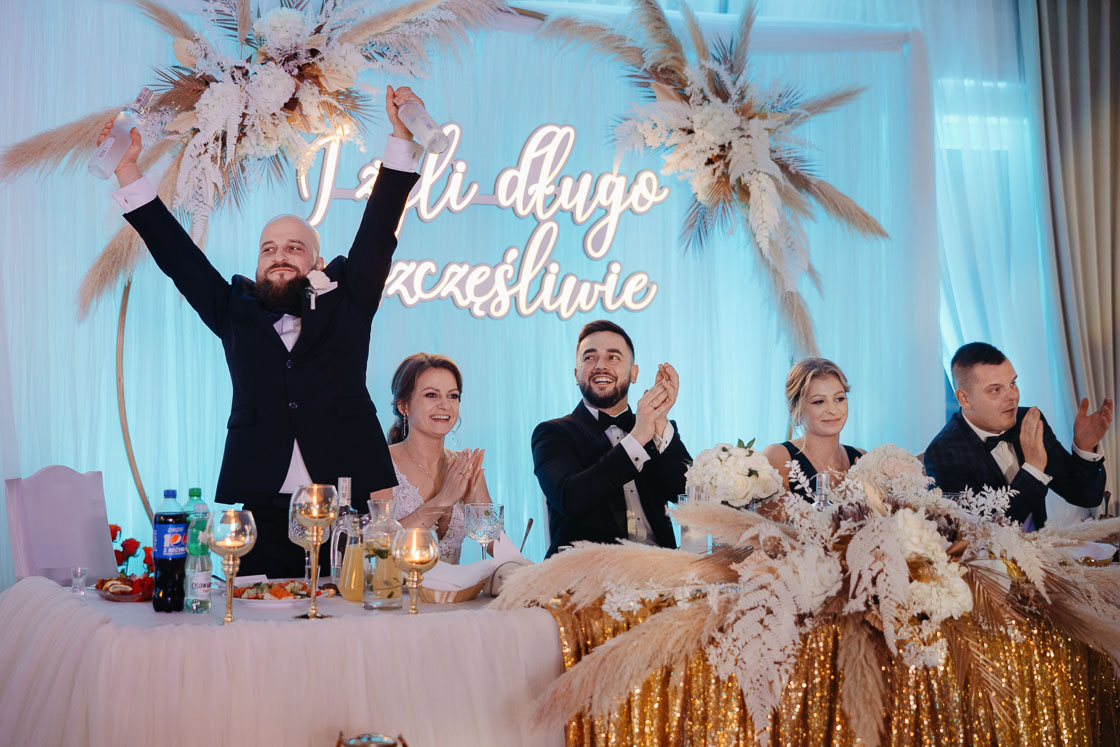 Czyli moment, na który wszyscy czekali najbardziej. Nic w tym dziwnego, w końcu na dworze temperatury w okolicach zera. Przyjęcie zaczynamy spokojnie, przy akompaniamencie smyczkowym. Goście składają życzenia nowożeńcom, którzy chwilę po uroczystej kolacji otworzą parkiet zmysłowym pierwszym tańcem w chmurach. Istny spektakl, świetnie przygotowany taniec zapiera dech w piersiach. Brawo Młodzi! Wszyscy ruszamy na parkiet i bawimy się do białego rana!