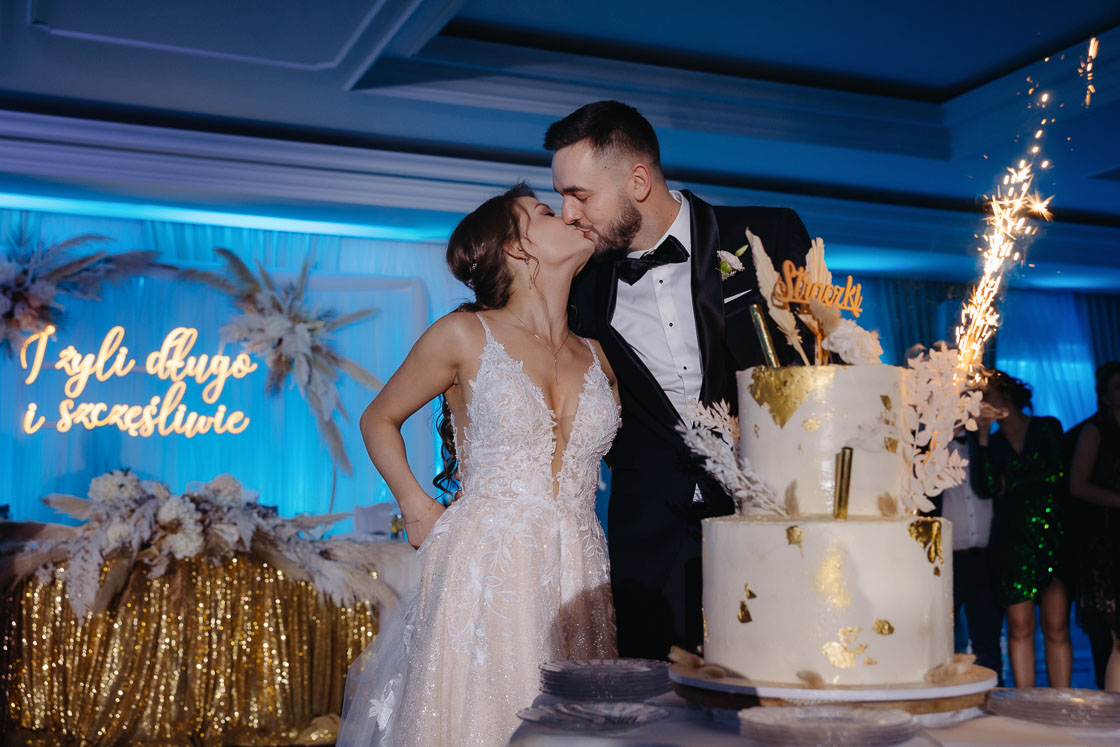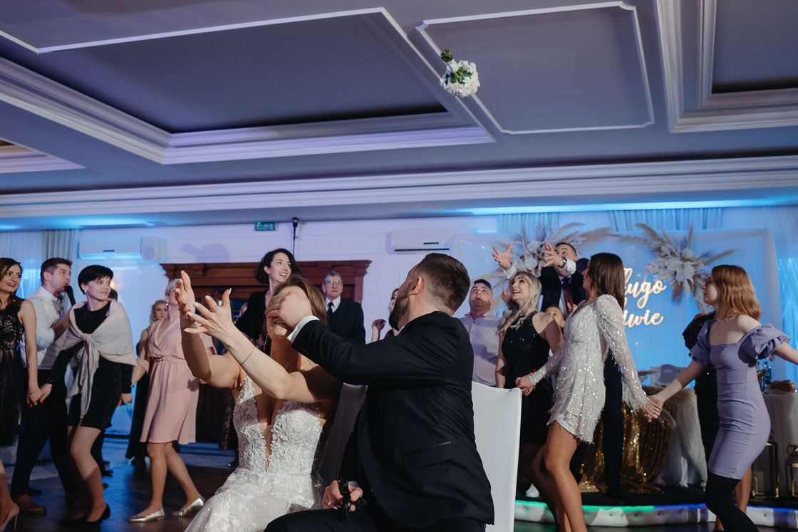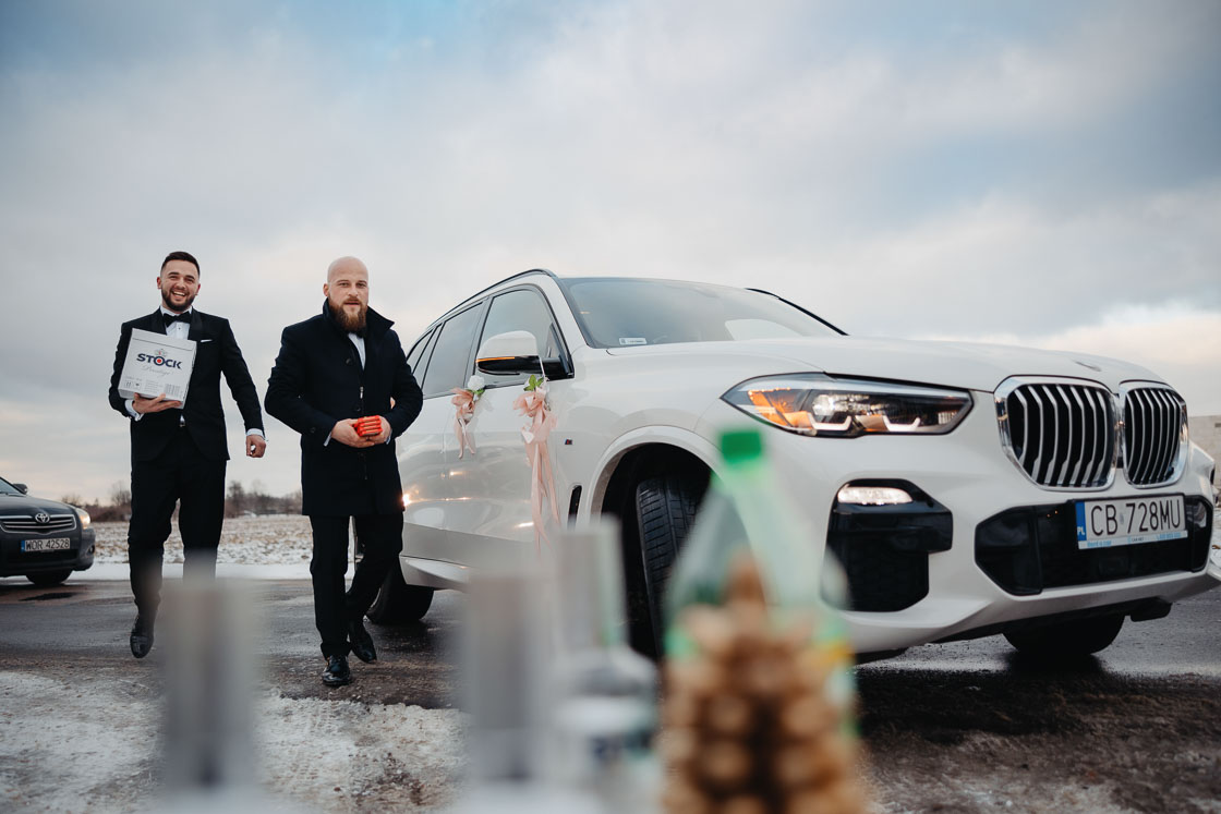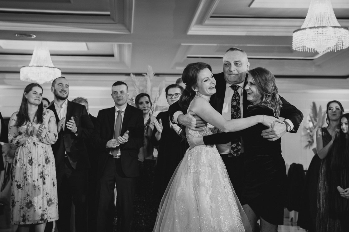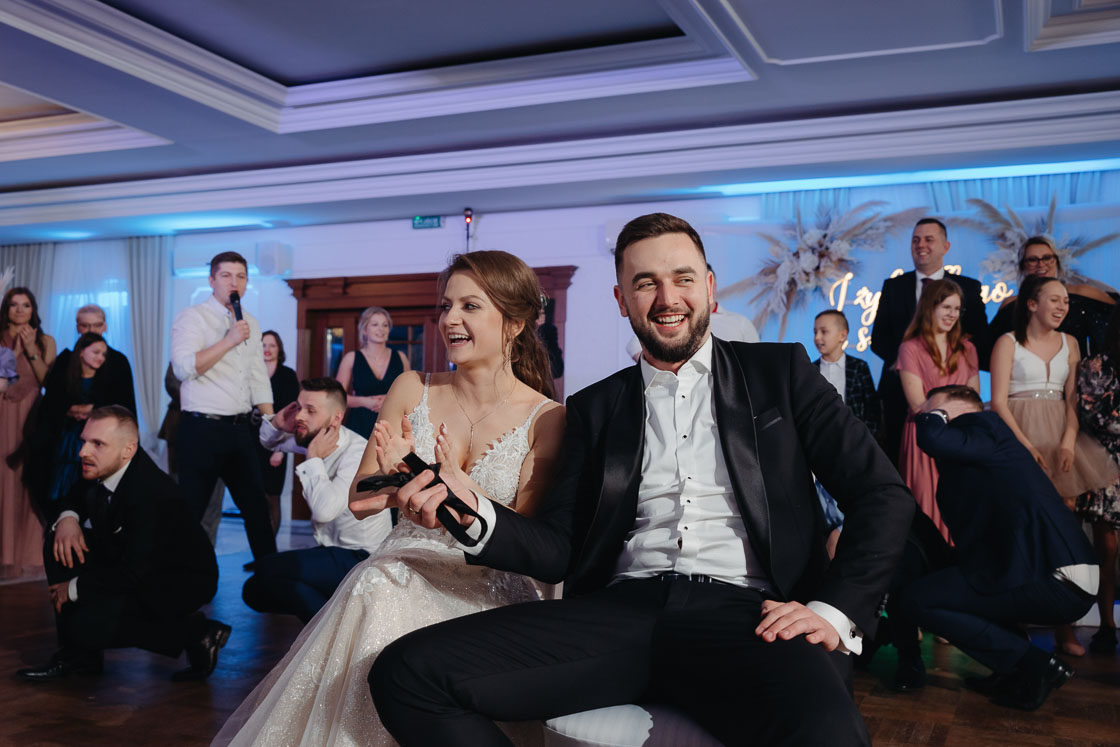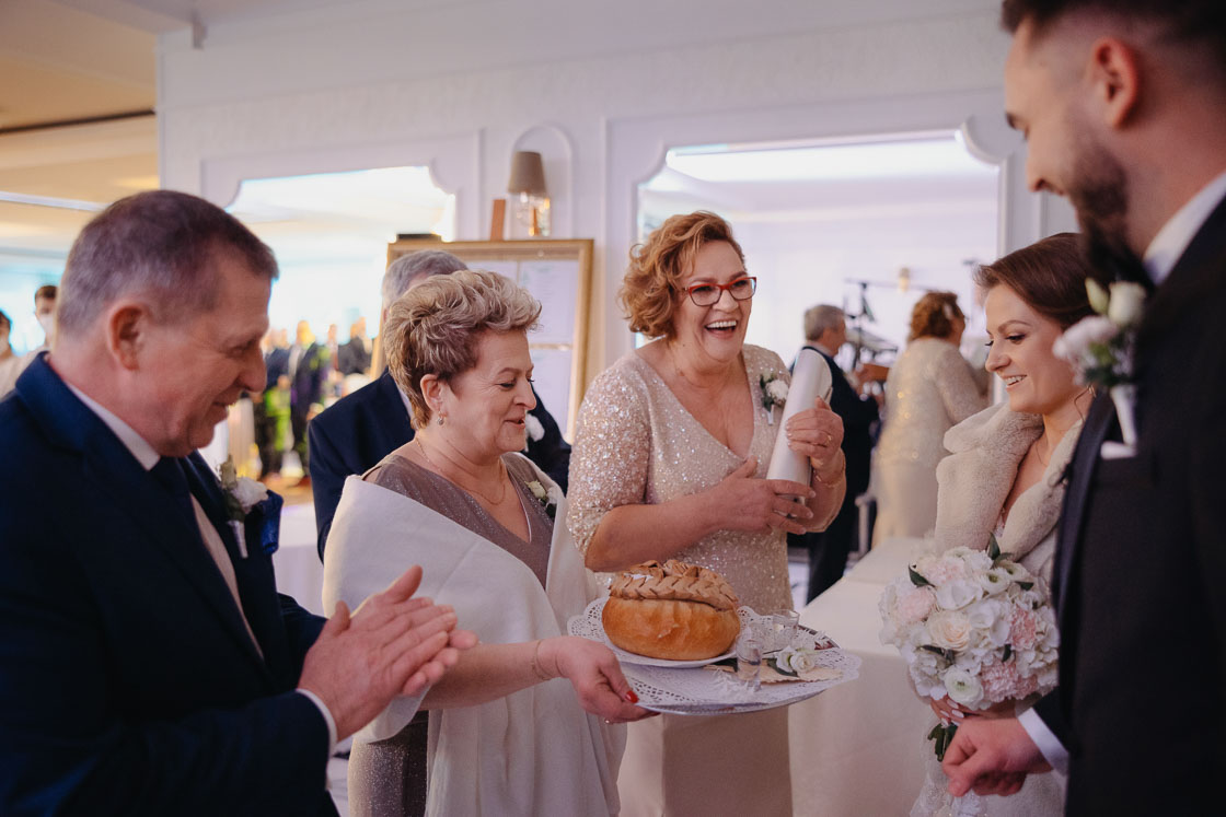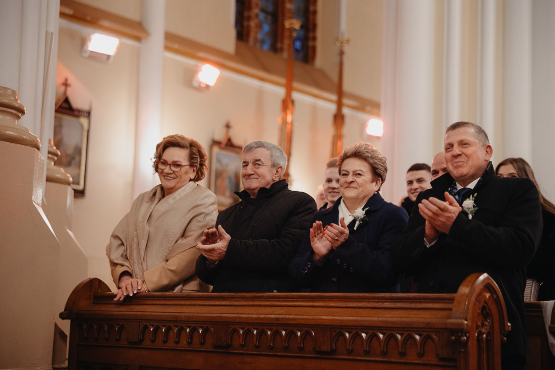Czyli moment, na który wszyscy czekali najbardziej. Nic w tym dziwnego, w końcu na dworze temperatury w okolicach zera. Przyjęcie zaczynamy spokojnie, przy akompaniamencie smyczkowym. Goście składają życzenia nowożeńcom, którzy chwilę po uroczystej kolacji otworzą parkiet zmysłowym pierwszym tańcem w chmurach. Istny spektakl, świetnie przygotowany taniec zapiera dech w piersiach. Brawo Młodzi! Wszyscy ruszamy na parkiet i bawimy się do białego rana!