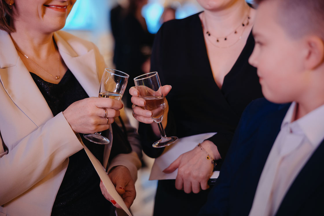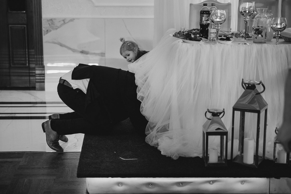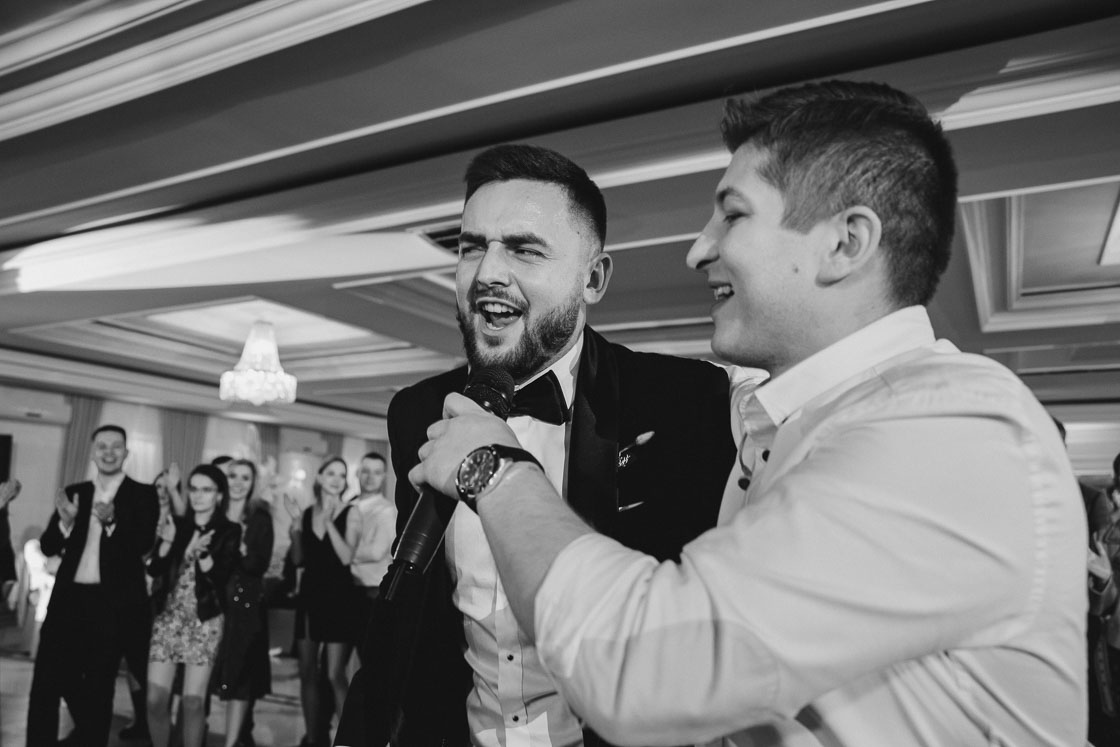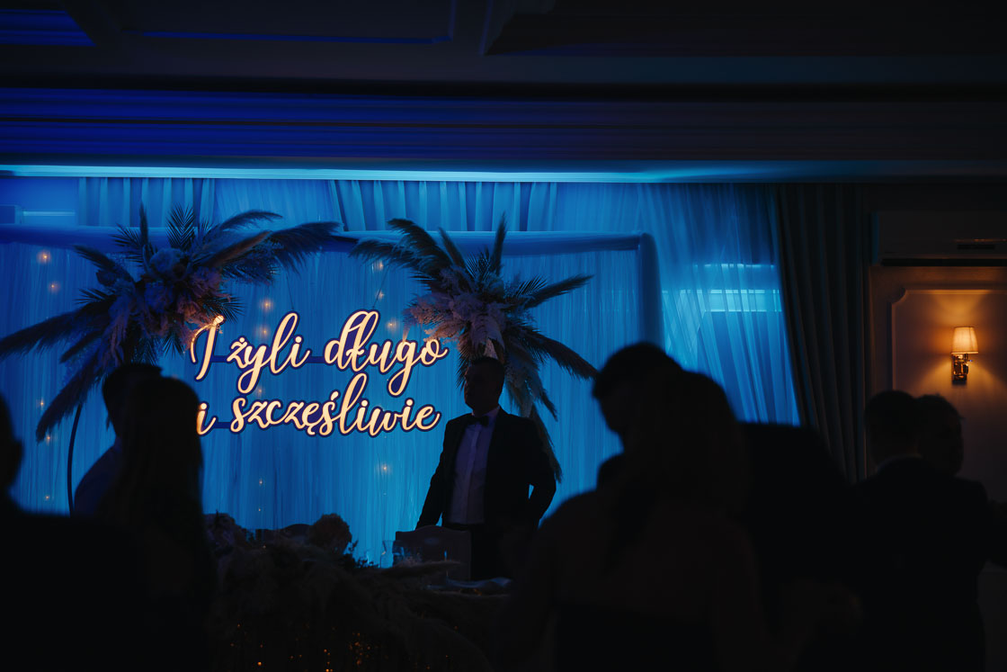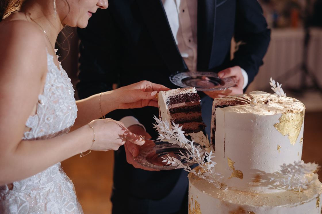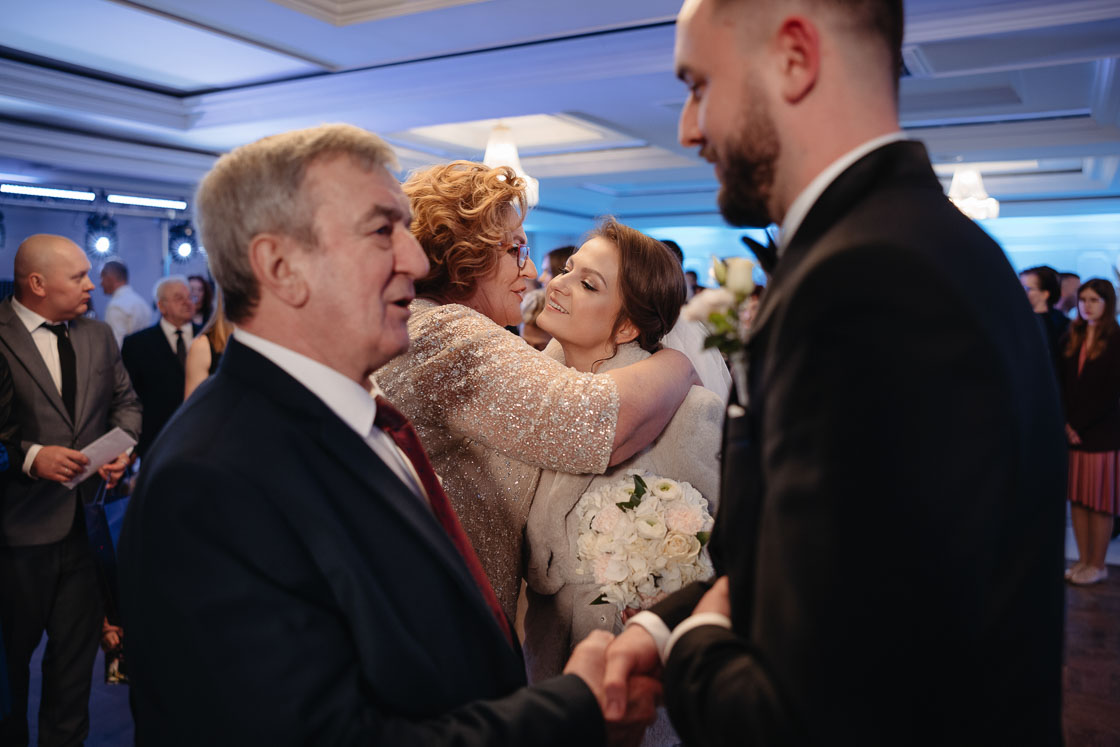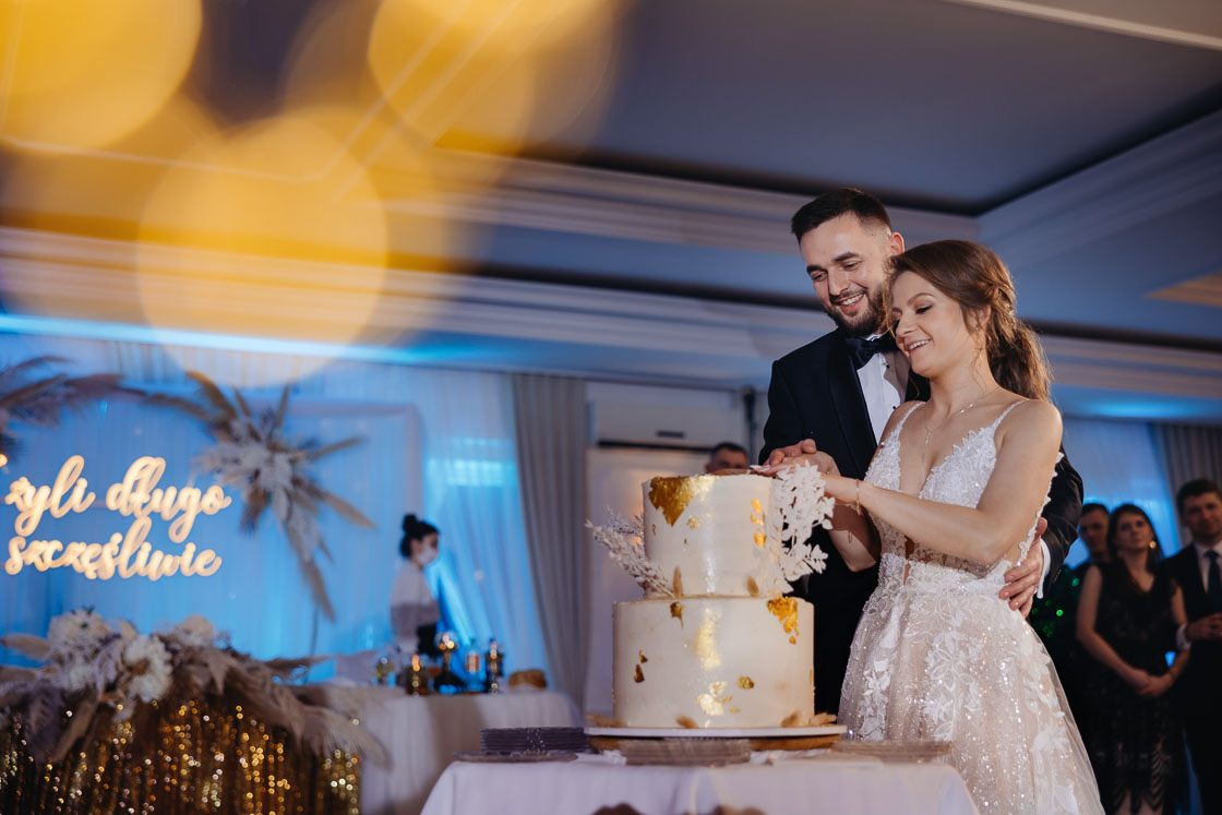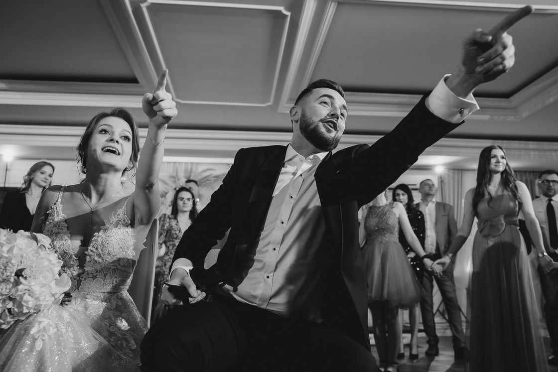 Czyli moment, na który wszyscy czekali najbardziej. Nic w tym dziwnego, w końcu na dworze temperatury w okolicach zera. Przyjęcie zaczynamy spokojnie, przy akompaniamencie smyczkowym. Goście składają życzenia nowożeńcom, którzy chwilę po uroczystej kolacji otworzą parkiet zmysłowym pierwszym tańcem w chmurach. Istny spektakl, świetnie przygotowany taniec zapiera dech w piersiach. Brawo Młodzi! Wszyscy ruszamy na parkiet i bawimy się do białego rana!