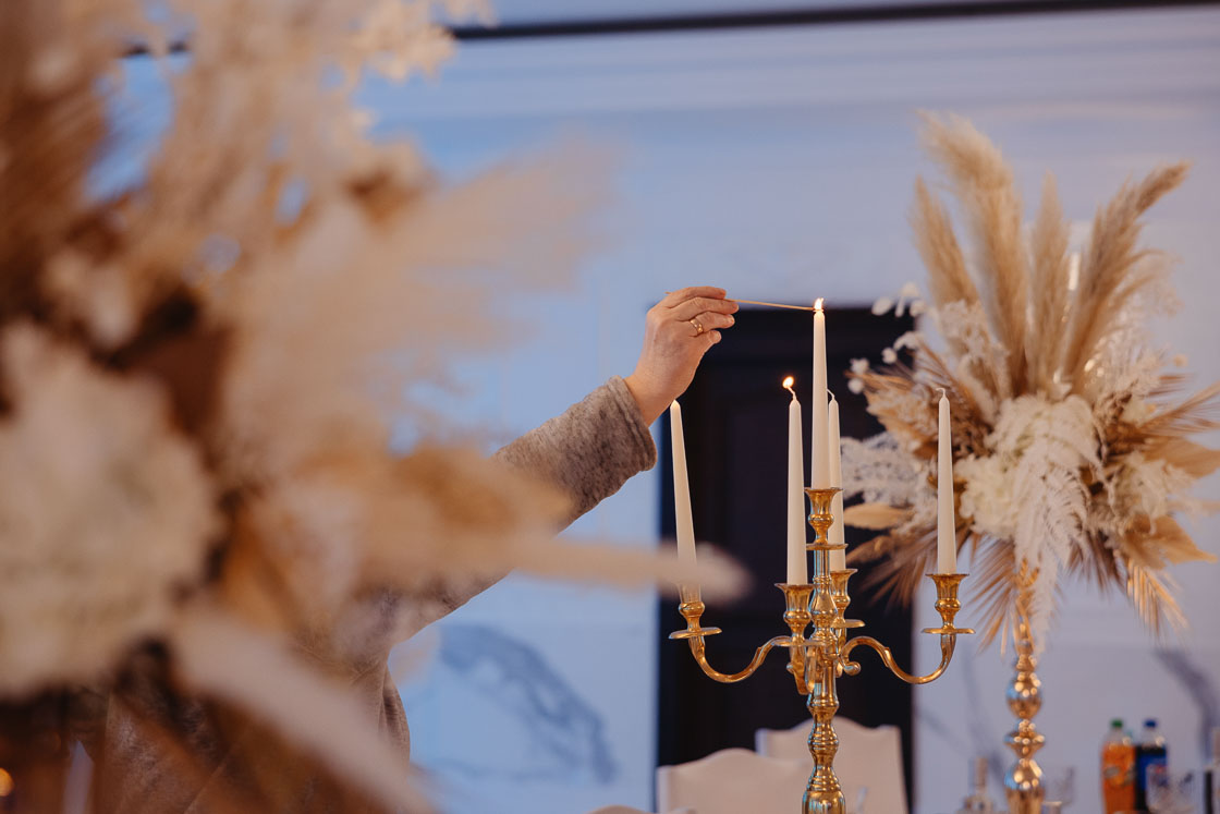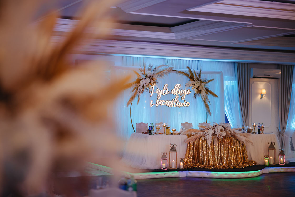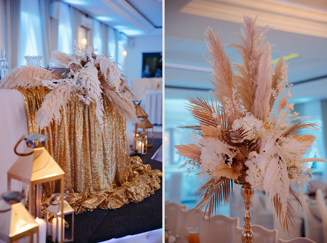 Styl dekoracji ukierunkowany jest wieloma aspektami. Klimat sali weselnej, upodobania Panny Młodej, jak również pora roku, w której organizowane jest wesele. Zgranie tych wszystkich elementów to nie lada wyzwanie, a zrobienie efektu WOW, który zaskoczy wszystkich gości, to istny majstersztyk! Taką pracę wykonała Edyta Kalinowska z pracowni kwiaciarniadalia.cudawianki. Dekoracje w stylu boho/glamour, pełne suszu traw, pampasów oraz złotych barw, idealnie wpisały się w styl zimowego ślubu, jak również we wnętrze sali. Zobaczcie efekt prac artystki florystki.